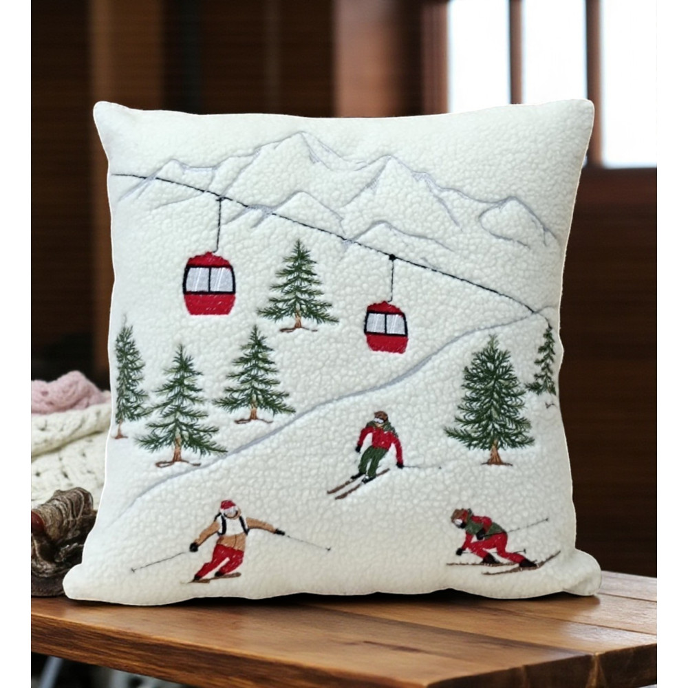 Holen Sie sich den Zauber des Urlaubs in den Bergen mit dem Skifahrer-Kissenbezug direkt nach Hause. Hergestellt aus weißem Lammfellfleece, ist es warm, weich und ideal für die Einrichtung von Winterumgebungen und Chalets.