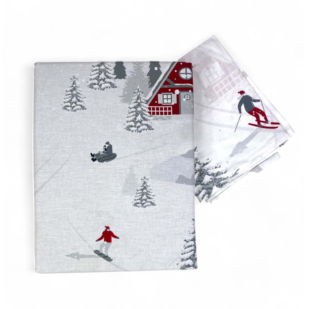 Made of 100% cotton, this duvet cover combines comfort, softness and breathability, perfect for any season. The double-sided design offers one side with a striking Tyrolean pattern, full of skiers, snowboarders and snowy chalets, and one side in solid gray, for a more sober and elegant look.