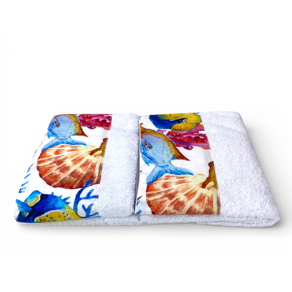 Juego de toallas de playa blanco Coral Fish - Esponja 100% algodón - Bordado náutico azul - Made in Italy