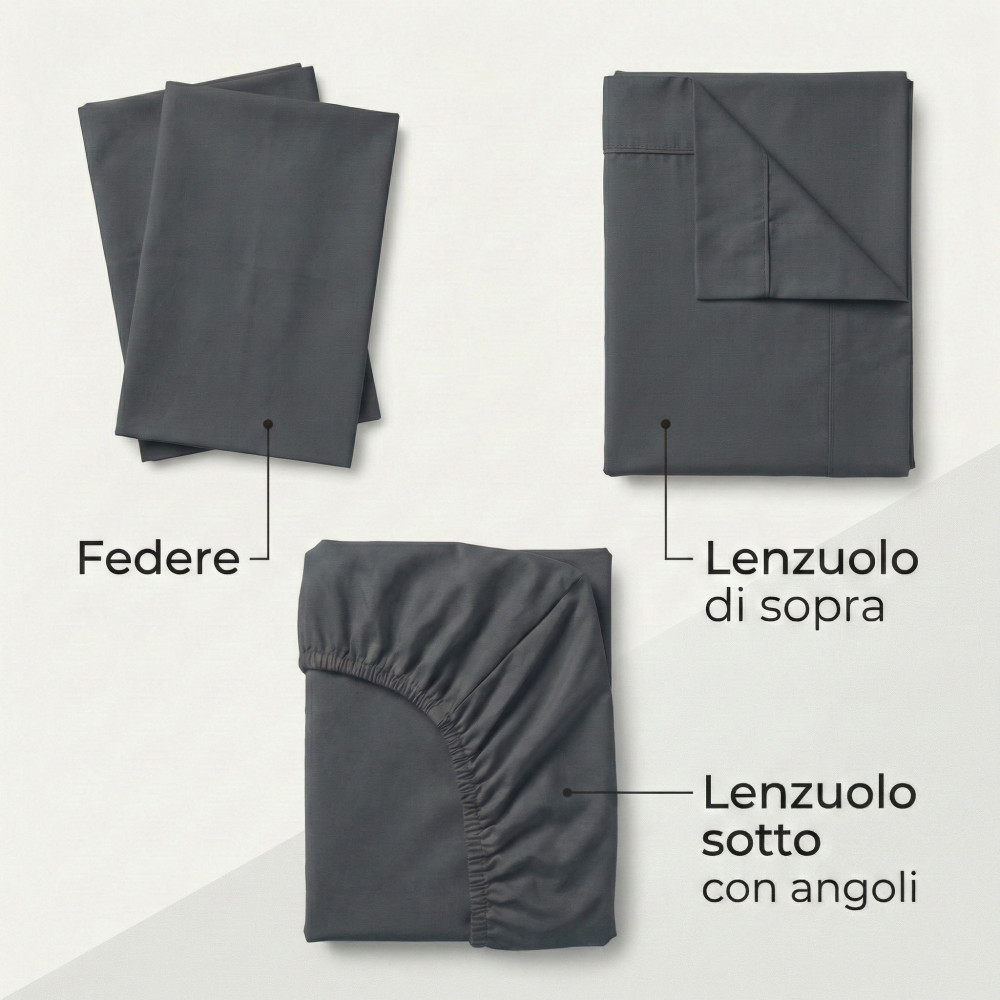 Il completo lenzuola Strong è la scelta ideale per chi desidera qualità, eleganza e comfort. 🛏️ Realizzato in 100% cotone puro, offre una superficie morbida, traspirante e resistente. 🌿 Il design in tinta unita grigio piombo si adatta perfettamente a qualsiasi stile di arredamento, donando un tocco di raffinatezza alla tua camera da letto. 🪄
