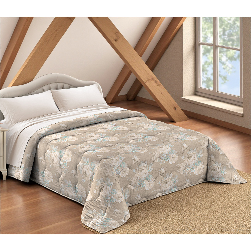 Il motivo floreale nei toni Tiffany su fondo neutro dona un tocco luminoso e sofisticato, rendendo questa trapunta perfetta per ambienti dallo stile classico o moderno. Un copriletto che decora e riscalda allo stesso tempo, donando armonia e charme alla stanza.